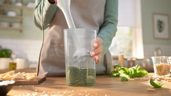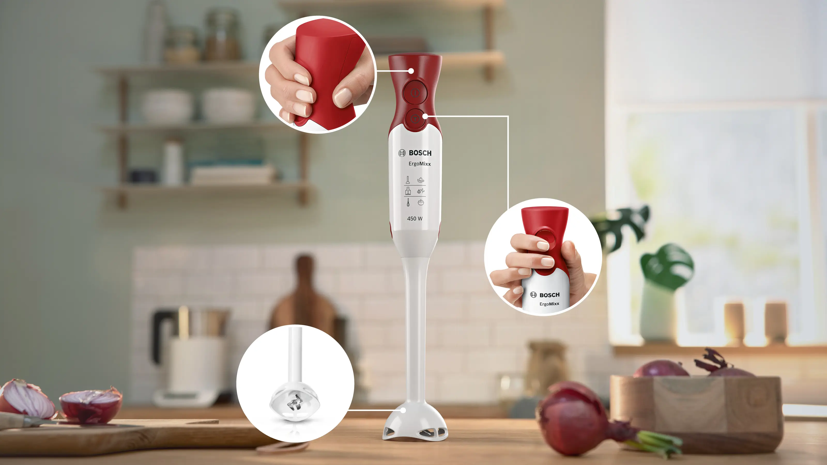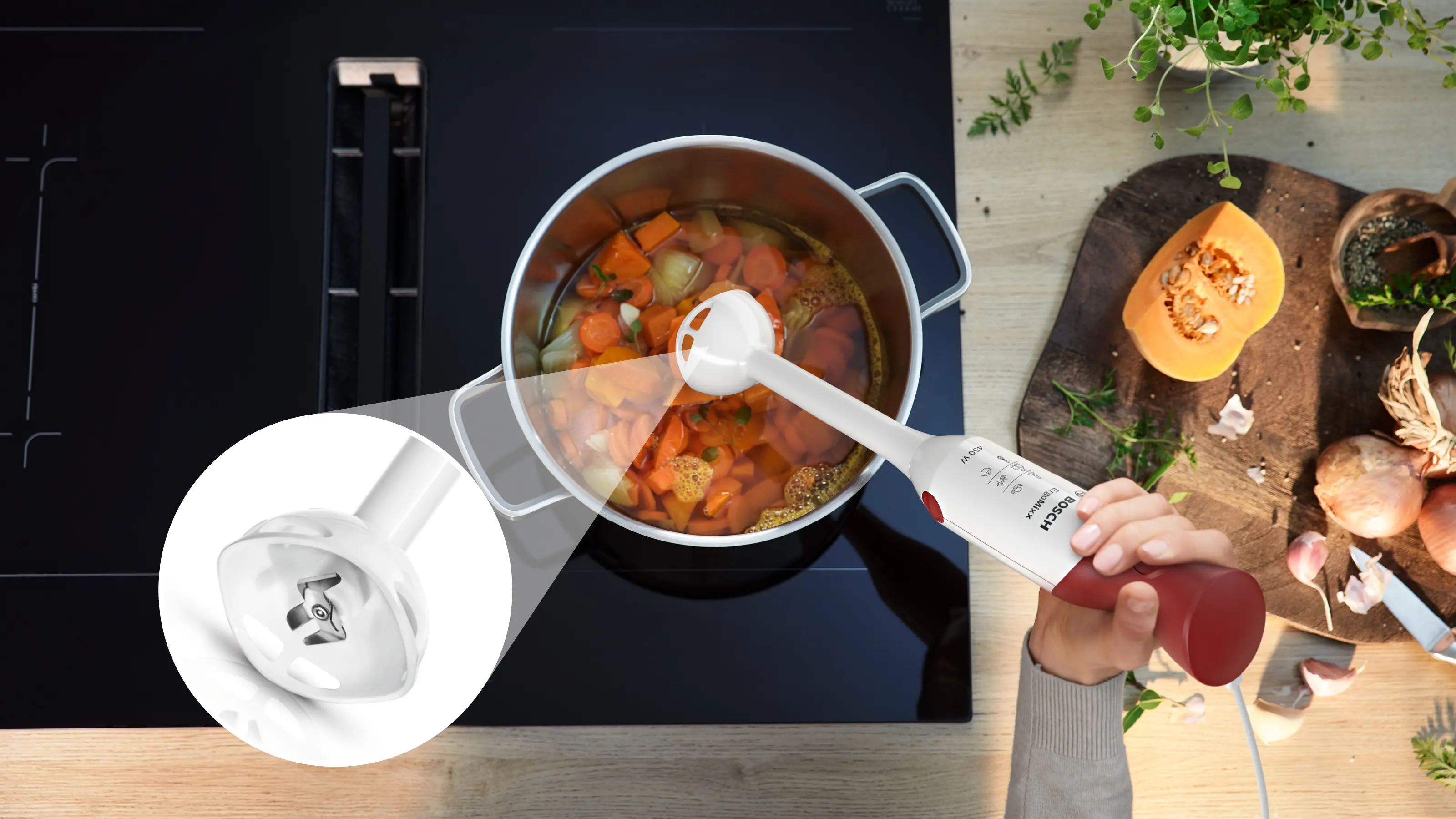 Patentovaný Bosch "Click - mechanismus" umožnuje snadné sejmutí mixovací nohy a příslušenství