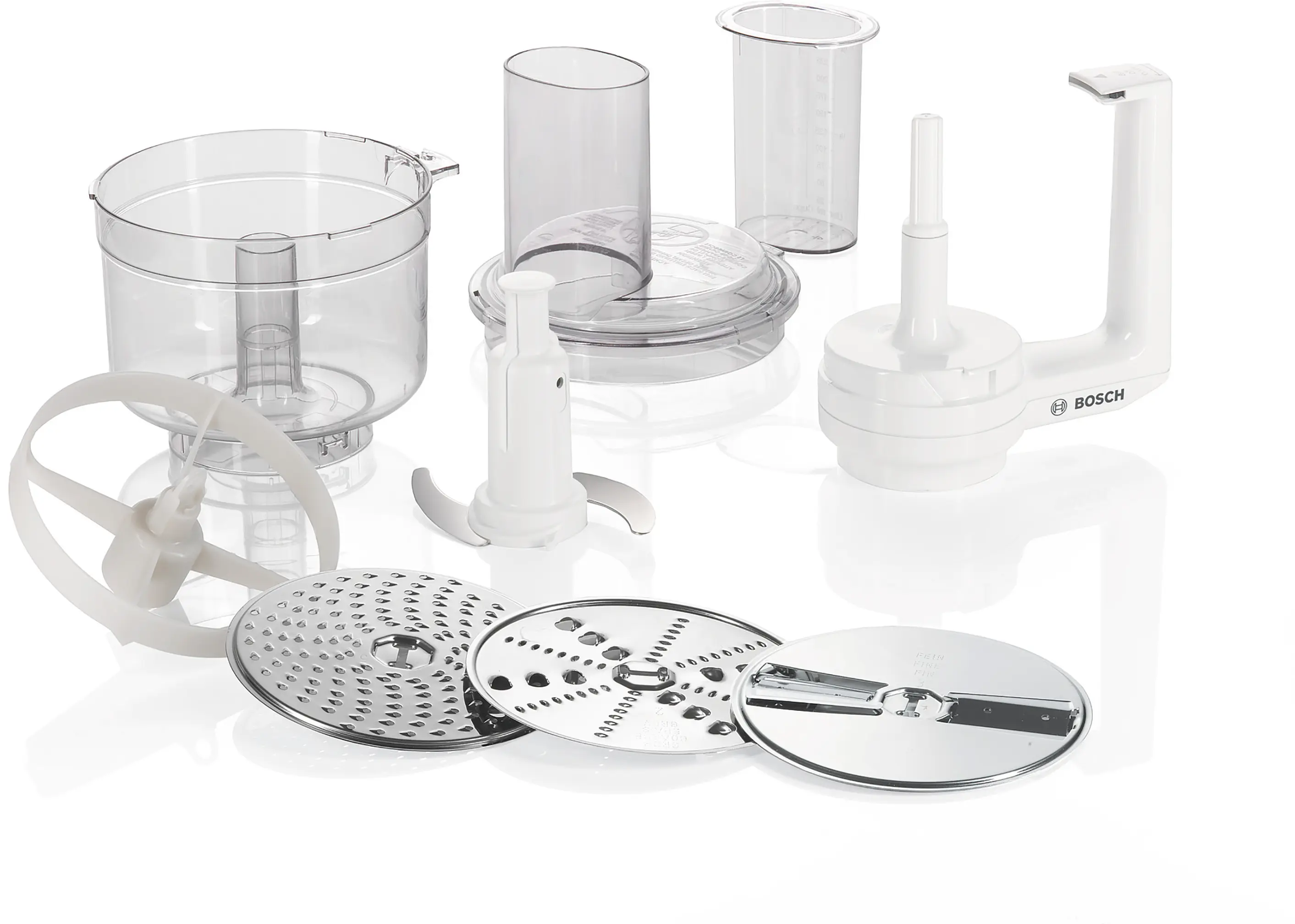 Sekací nůž, krouhací kotouč (hrubý a jemný), krájecí koutouč (silný a tenký), strouhací kotouč středně jemný (=5 funkcí)