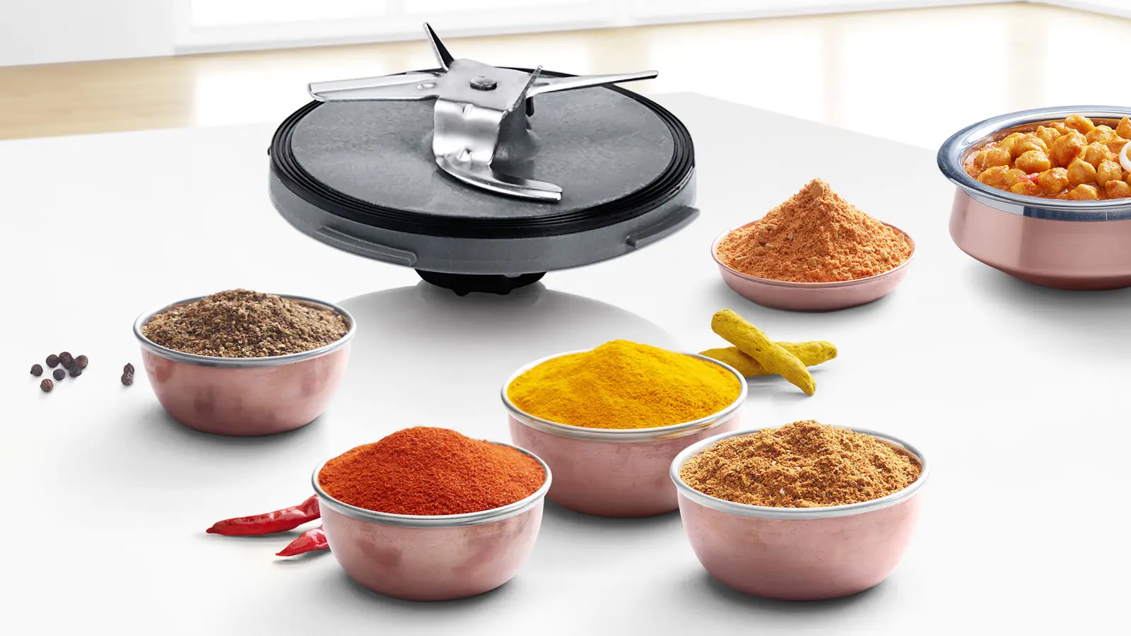 Mlýnek na zpracování tvrdých surovin, jako je káva, tvrdý sýr, obilí, koření, nebo kostky ledu.