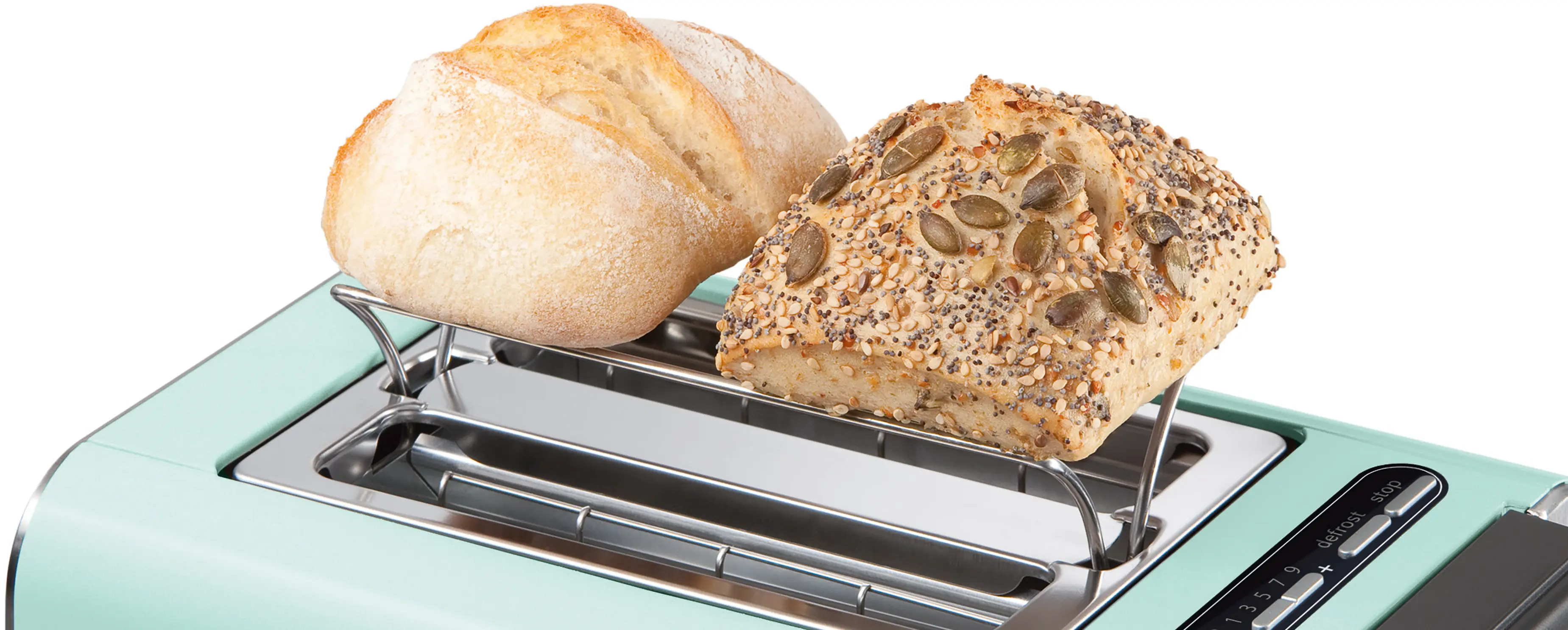 MirrorHeating :Skvělá snídaně se neobejde bez čerstvého a křupavého pečivaLahodná vůně čerstvě opečeného chleba a jeho rovnoměrně zlatavá barva představují to, proč je opékání tak oblíbené. Funkce MirrorHeating zajistí pokaždé perfektní toast. Teplo vzniká pomocí čtyř tyčí z křemenného skla a odrazového zrcadla, které nasměruje teplo zpět na pečivo. Díky tomu se rovnoměrně ohřívá po celém povrchu. | ![]() |