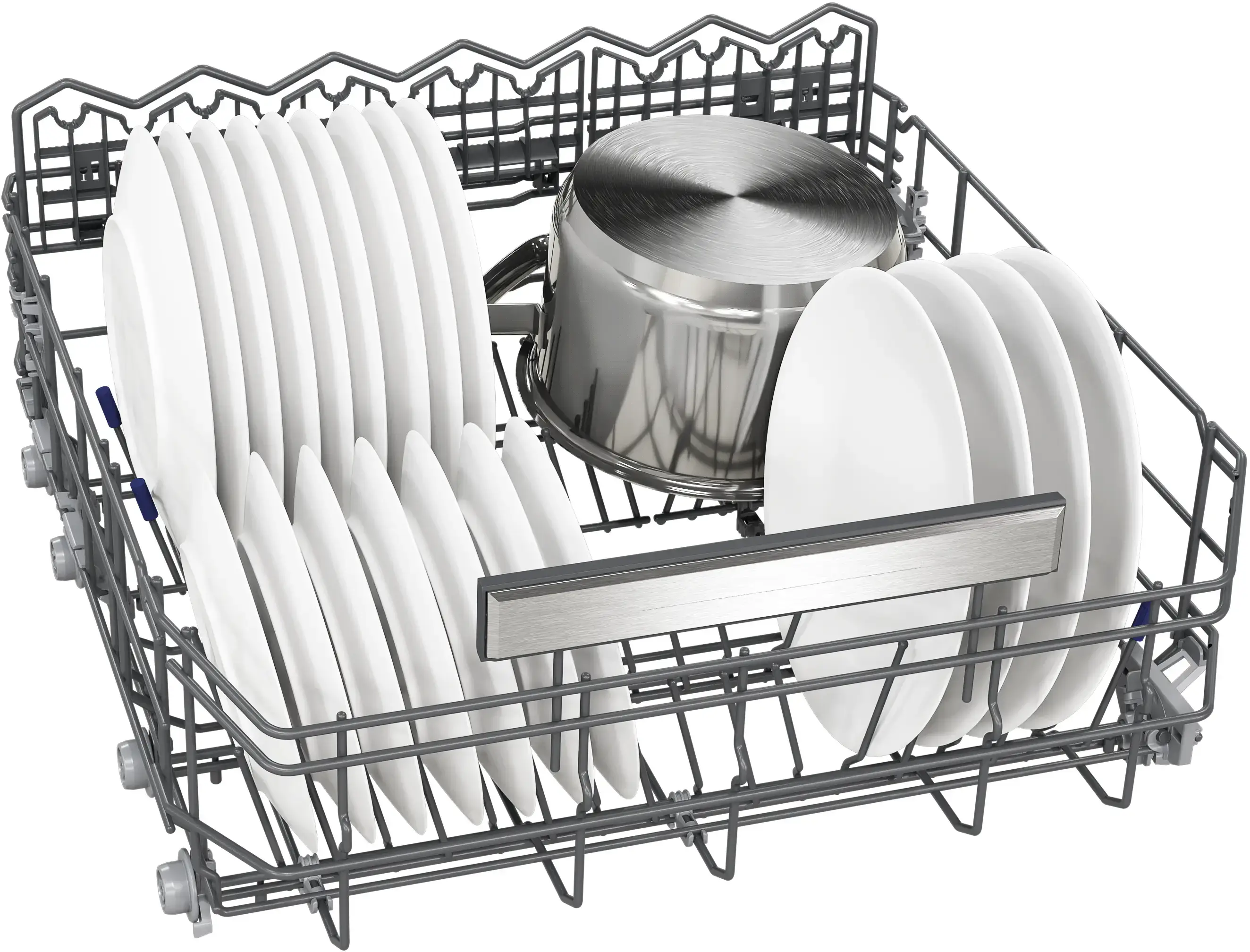 Ve třech úrovních výškově nastavitelný horní koš - rackMatic.Systém rackMatic umožňuje jednodušší nakládání a vykládání nádobí, zejména při manipulaci s velkými hrnci nebo talíři. Výšku horního koše lze snadno nastavit ve třech úrovních pro vytvoření více či méně místa, i když je myčka naložena. | ![]() |