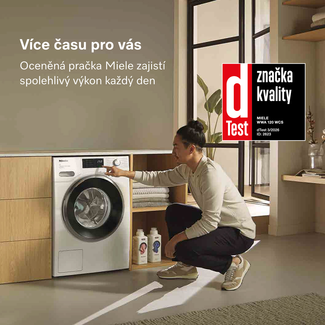 6.Během vývojové fáze řady praček W1 testovala společnost Miele jednotlivé modely a základní komponenty v 5 000 cyklech praní (= 5 cyklů praní týdně při použití v 50 týdnech za rok) s různými programy. Více na: miele.cz/20let