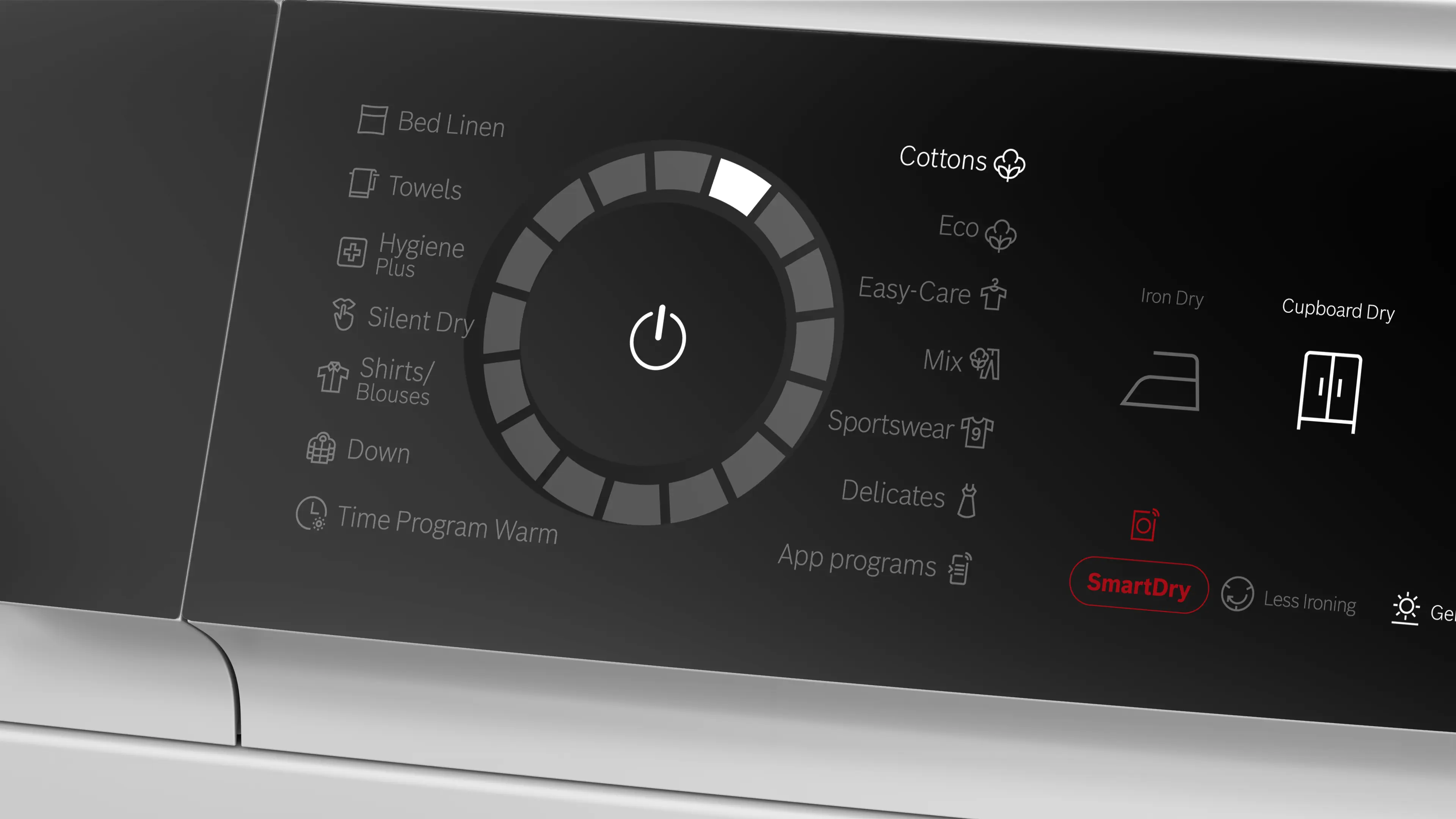 TouchControl tlačítka: základní nastavení, suché k žehlení, suché do skříně, extra suché do skříně, odložení konce programu, poloviční náplň, dětská pojistka, snadné žehlení, moje oblíbené, zapnutí/vypnutí, vzdálený start, šetrný, SmartDry, start/reload/pauza, Speed Perfect, odložení startu až o 24 hod.