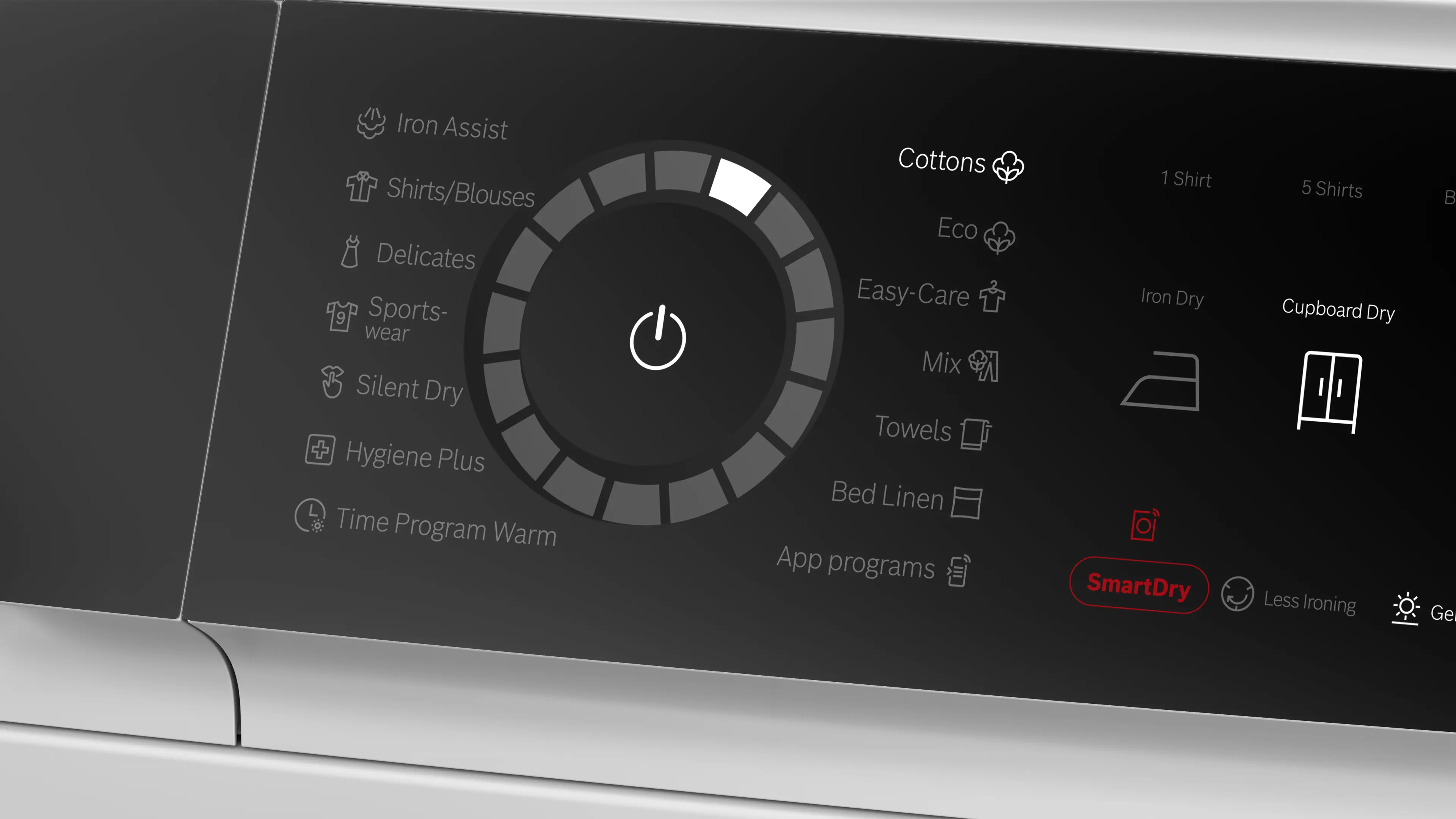 TouchControl tlačítka: 1 košile, 5 košil, základní nastavení, suché k žehlení, oblek, suché do skříně, extra suché do skříně, odložení konce programu, poloviční náplň, dětská pojistka, snadné žehlení, moje oblíbené, zapnutí/vypnutí, vzdálený start, šetrný, SmartDry, start/reload/pauza, Speed Perfect, odložení startu až o 24 hod.