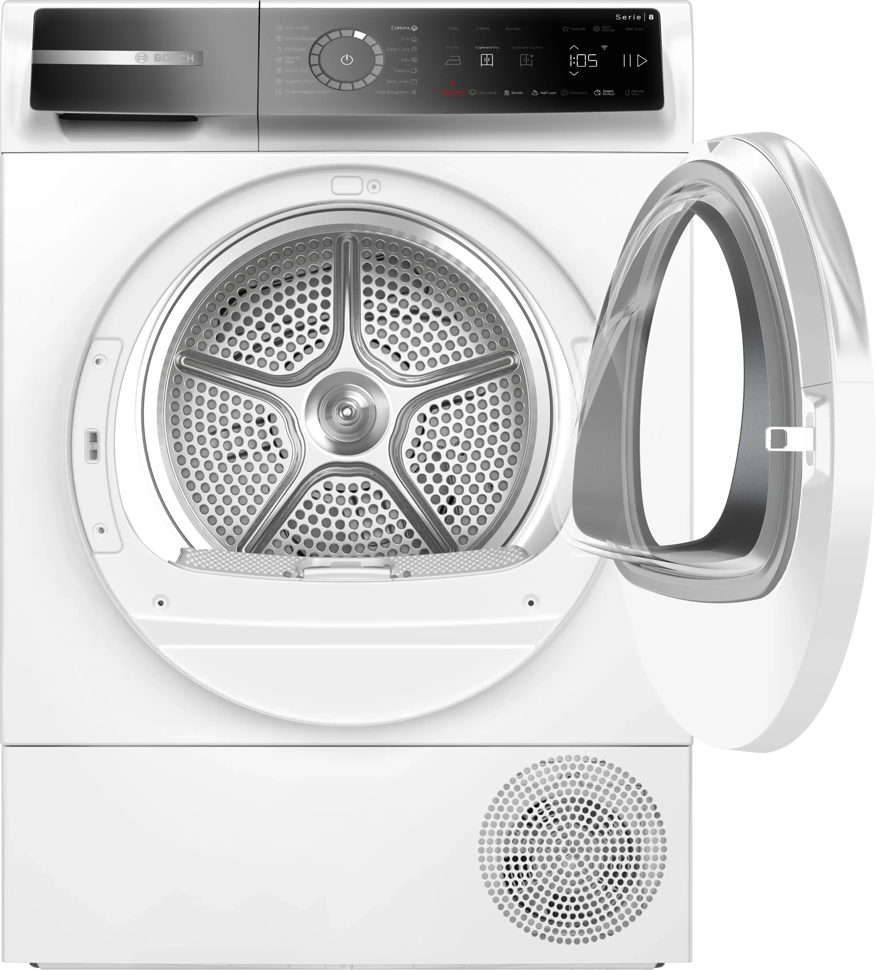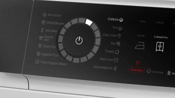 speciální programy: další programy přes aplikaci, bavlna, ložní prádlo, košile/halenky, bavlna eco, jemné, ručníky, Hygiena Plus, Iron Assist, mix, tiché sušení, sport/fitness, snadno udržovatelné, časový program teplý