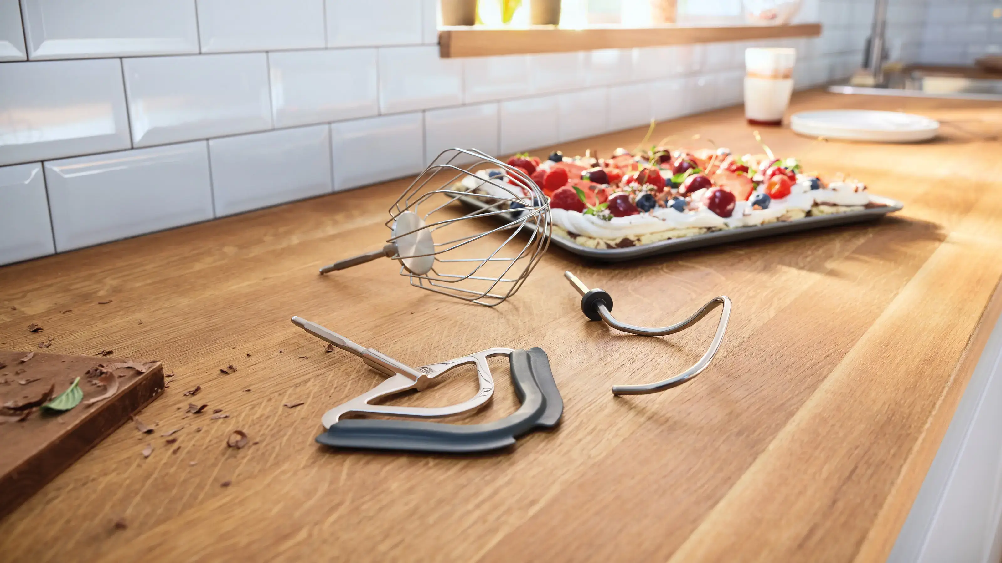 Profesionální cukrářská sada pro dokonalé výsledky: profesionální míchací metla se silikonovým okrajem, profesionální šlehací metla (celokovová s nastavitelnou výškou), hnětací hák s ochranou převodovky