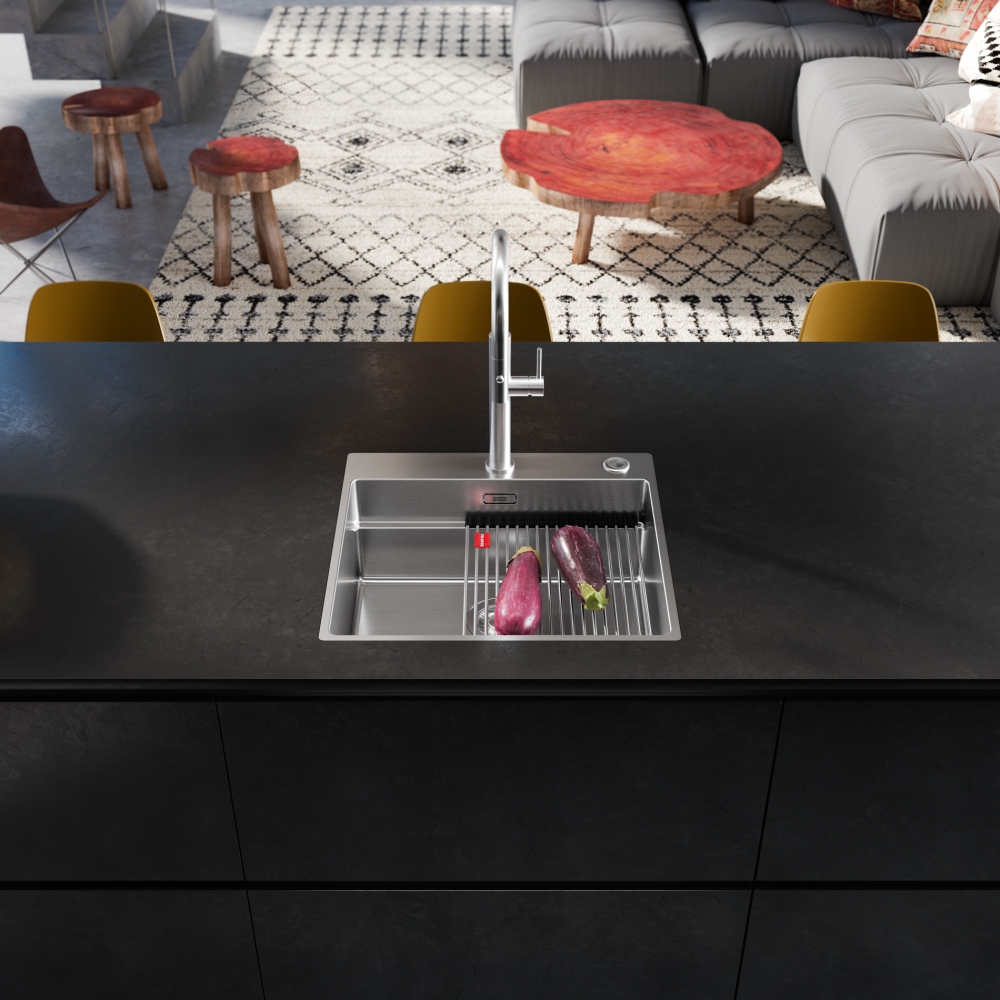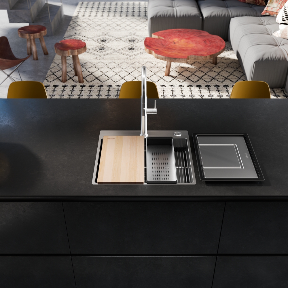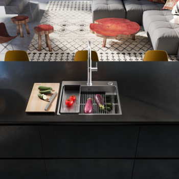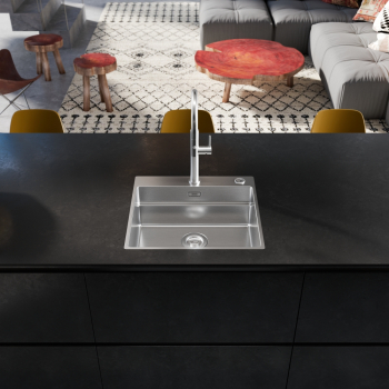 Nerezový dřez Box Pro. Cena zahrnuje: Easy Click sítkový ventil 3 1/2“ s přepadem. Sifon pro úsporu místa 6/4“ s odbočkou na myčku nádobí. Otvor pro baterii Ř 35 mm a pro Easy Click knoflík Ř 35 mm. Plochý okraj. Fixační příchytky Fast-Fix. V ceně dřezu doplňky: miska, přípravná deska a rolovací rošt.