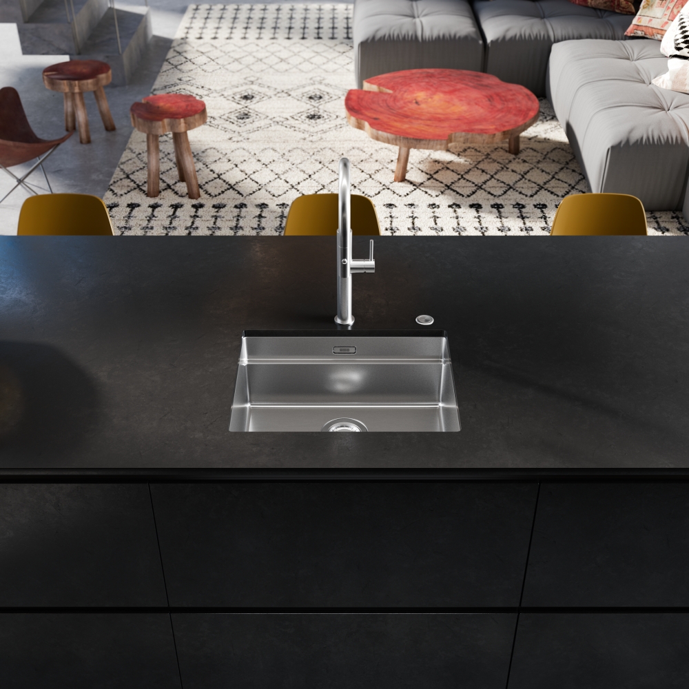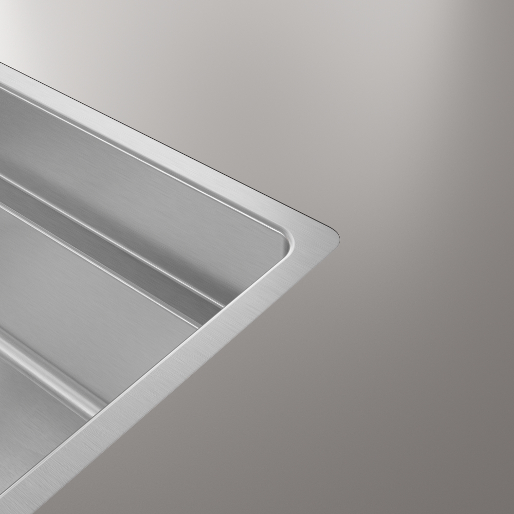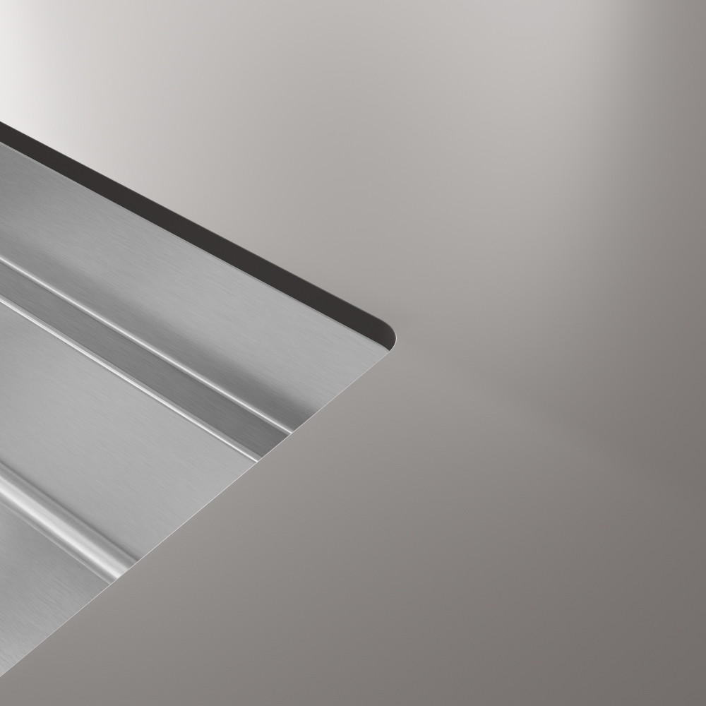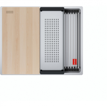 Nerezový dřez Box Pro. Cena zahrnuje: Easy Click sítkový ventil 3 1/2“ s přepadem. Sifon pro úsporu místa 6/4“ s odbočkou na myčku nádobí. Fixační příchytky Fast-Fix. V ceně dřezu doplňky: miska, přípravná deska a rolovací rošt.