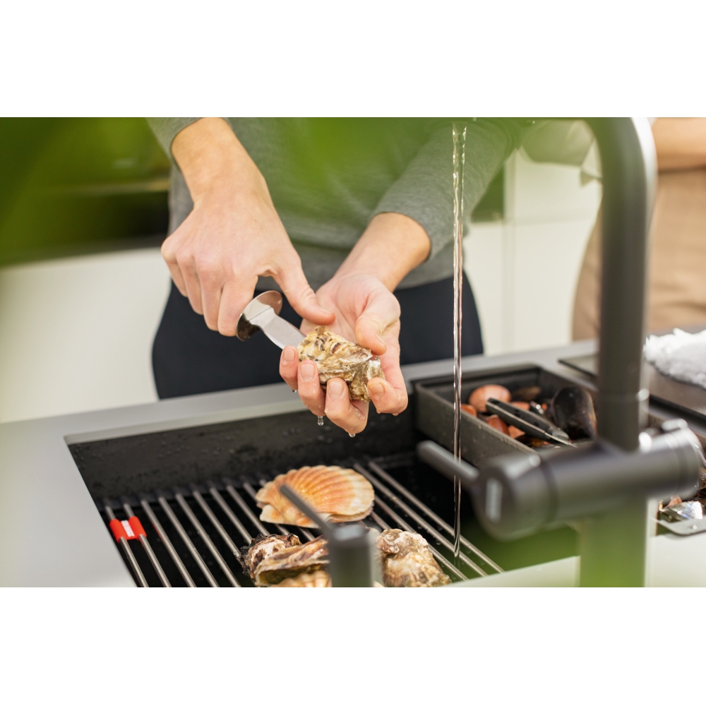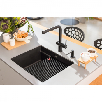 Fragranitový dřez Kubus 2. Cena zahrnuje: Sítkový ventil 3 1/2" s přepadem a nerezovou krytkou ventilu. Sifon pro úsporu místa 6/4 “ s odbočkou na myčku nádobí. V ceně dřezu doplňky: miska, přípravná deska a rolovací rošt.